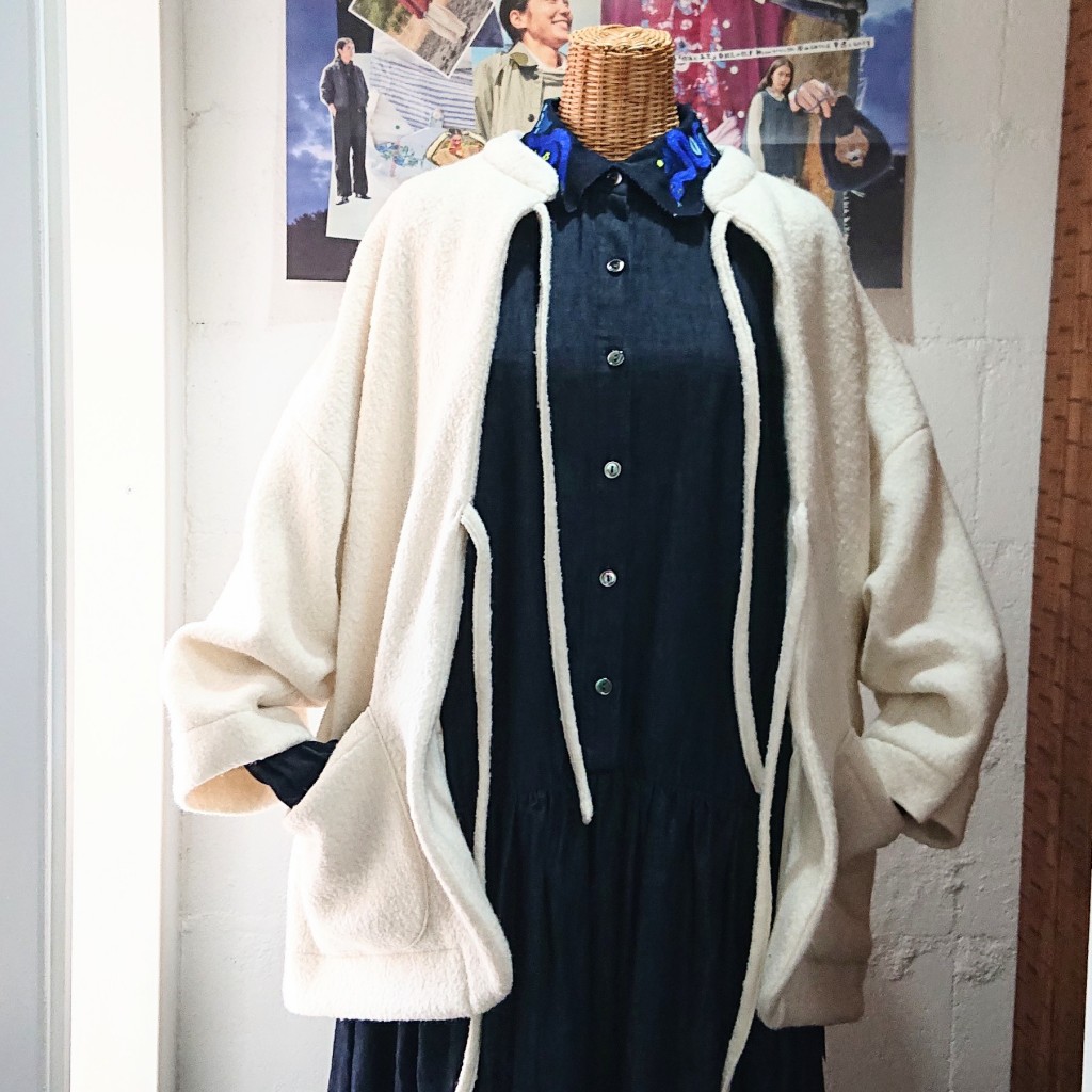 新作のレディースジャケット。紐で留めるデザインのアウターが出来上がりました。サイドにはポケットも付いています。素材は羊の毛(シープ)のように、もこもことした表面に加工されたパイル生地に裏地にはオリジナルのトラ柄のキュプラ素材を使用しています。ふわりと優しい柔らかな触り心地です。