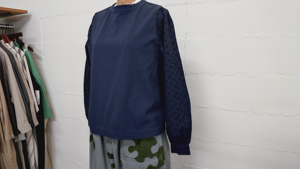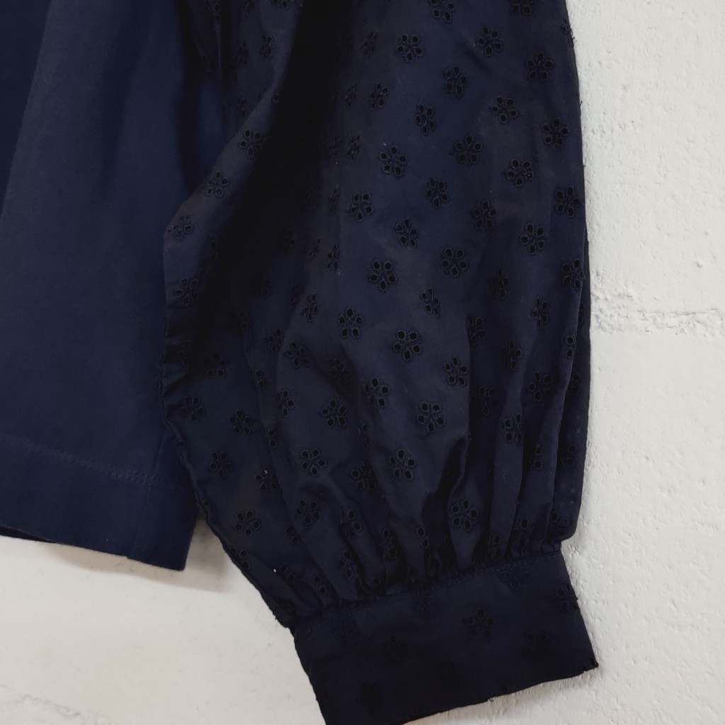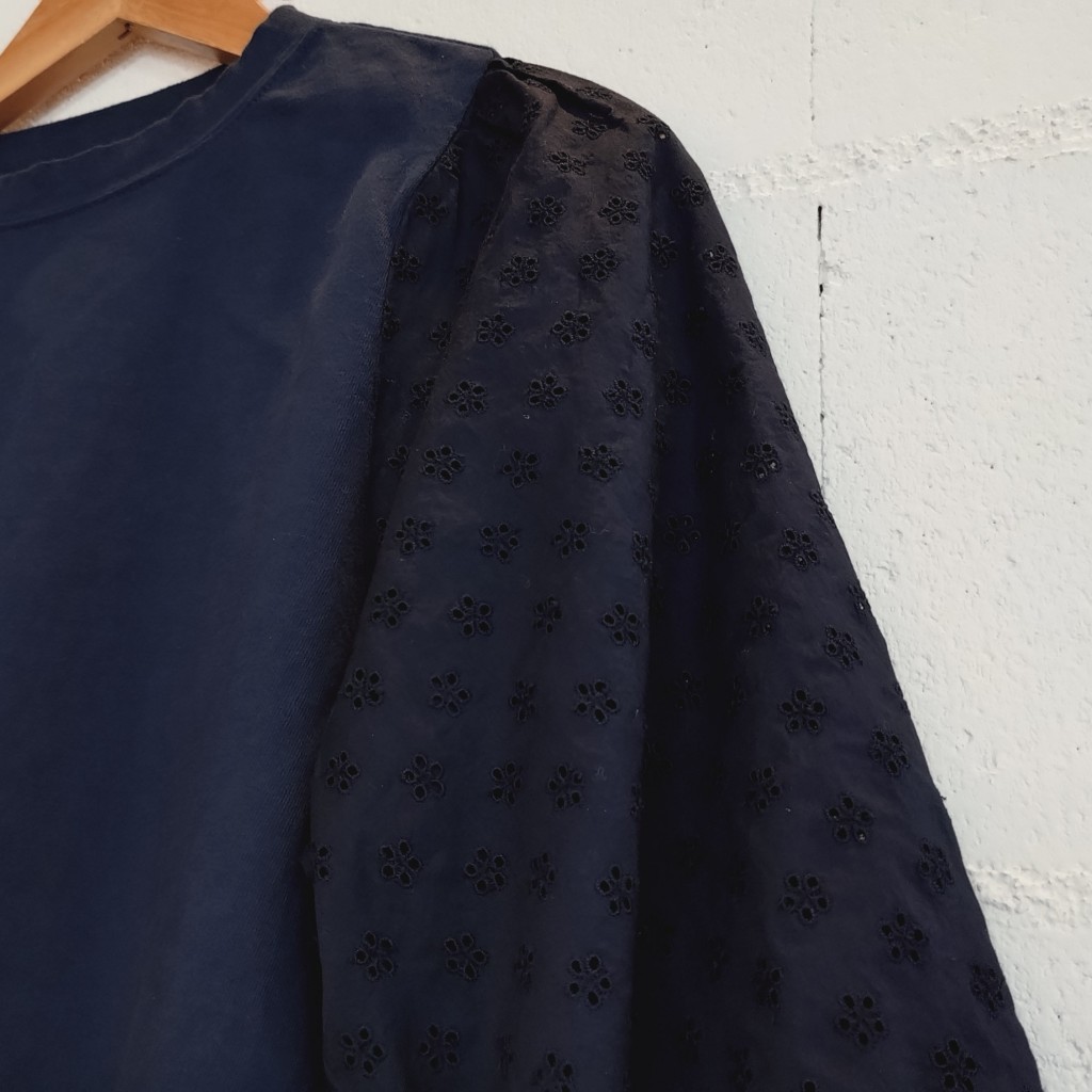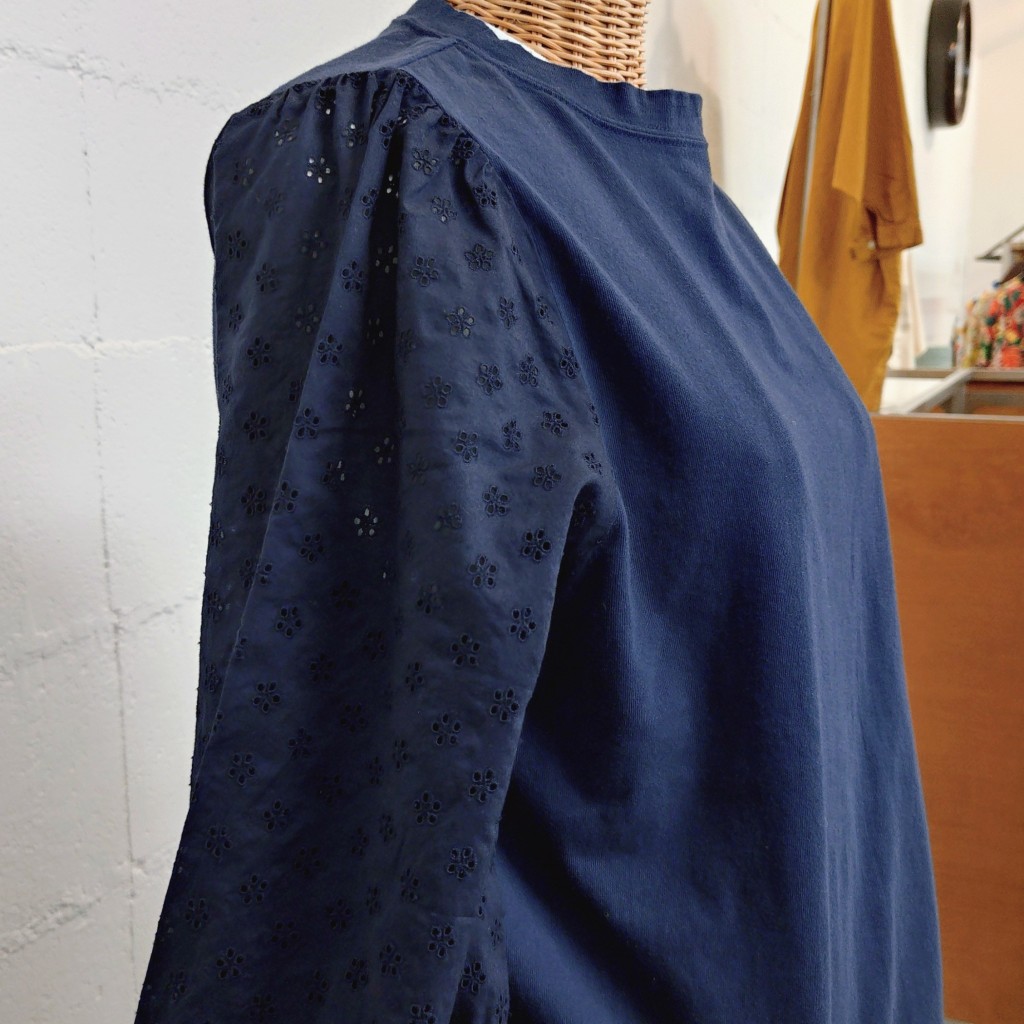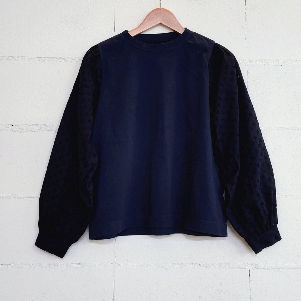 透け感あるレース素材とカットソー生地を組合せた長袖Tシャツ。袖はパフスリーブで、たっぷりとした袖元も可愛らしい一枚です。首元の開き具合は程よく上品に。ふわりと軽い着心地は、シーズン長く使える一着です。