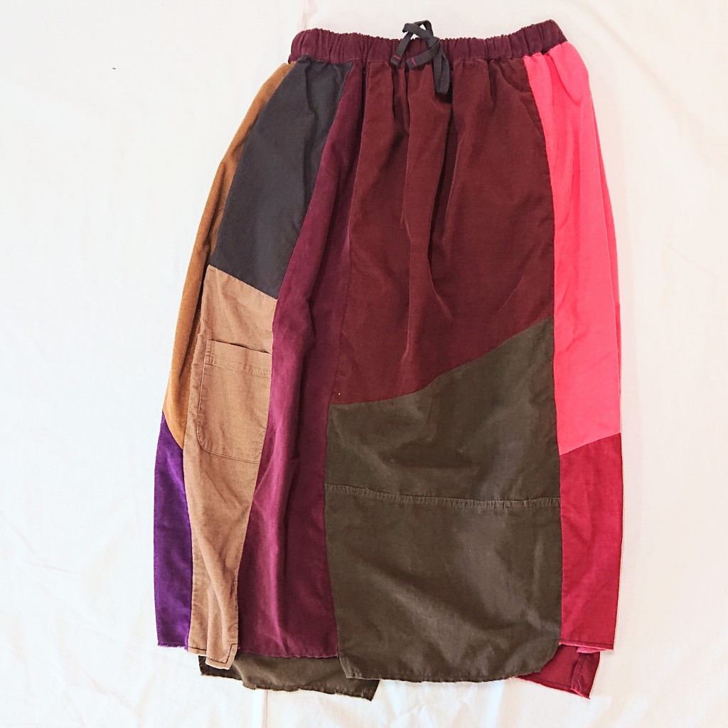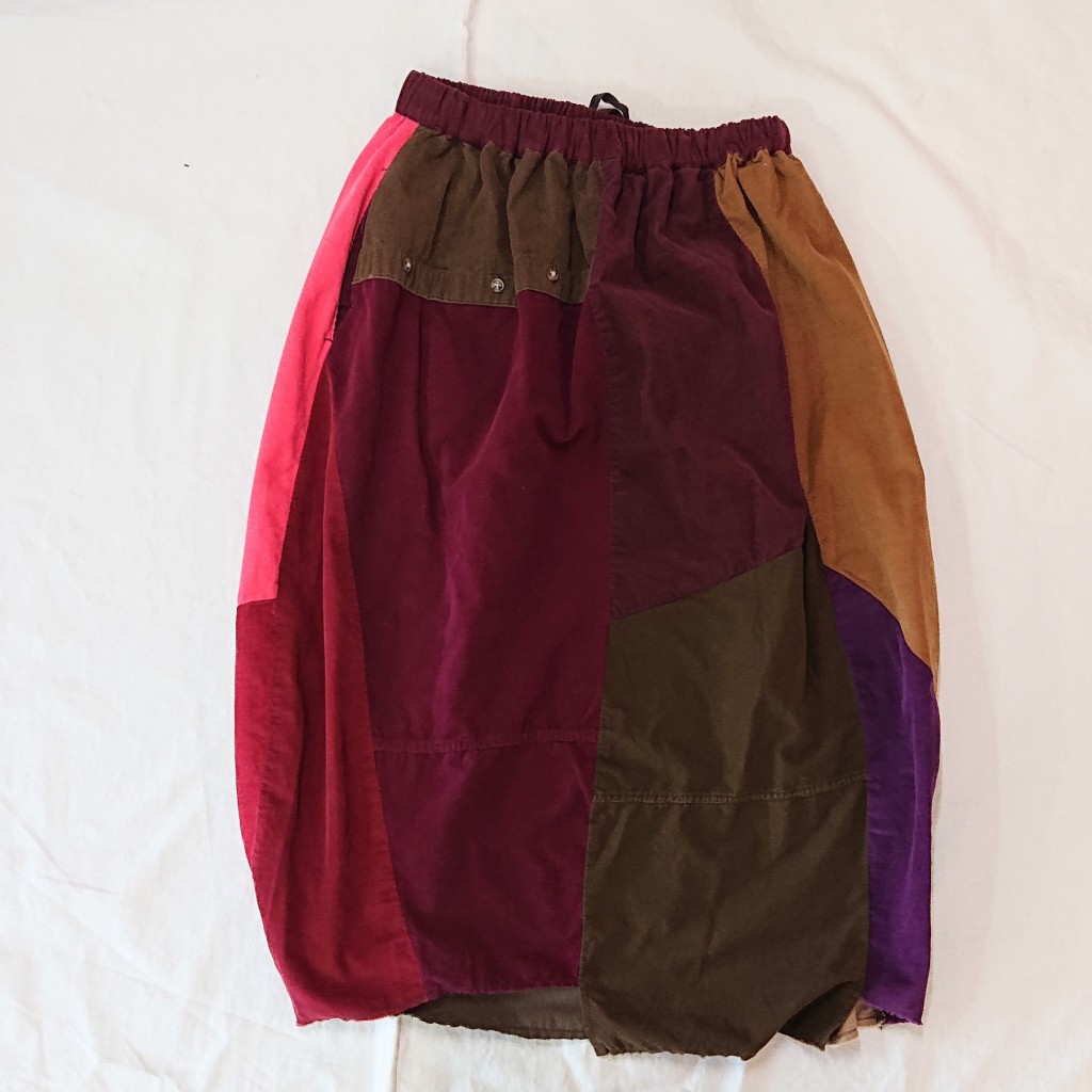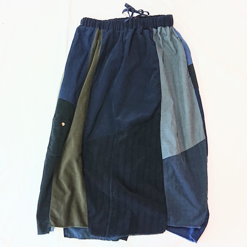 ヴィンテージのユーロコールシャツを解体し再構築。形はランダムパッチロングスカートを仕立てました。ブラウンとネイビーの色合いが少しずつ異なり、コーディネートのポイントになるスカートです。柄物のボトムを主役にコーディネートをお楽しみください。