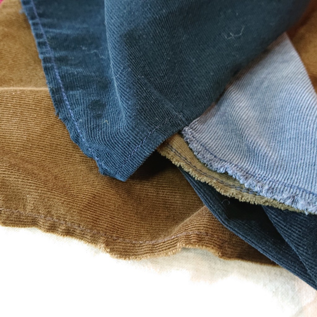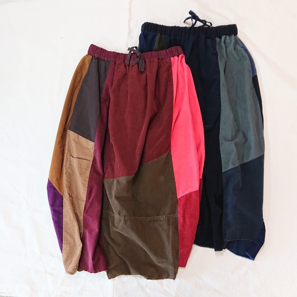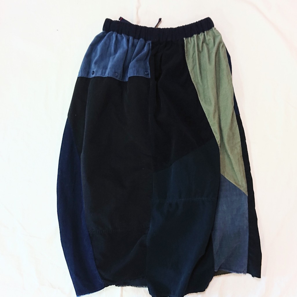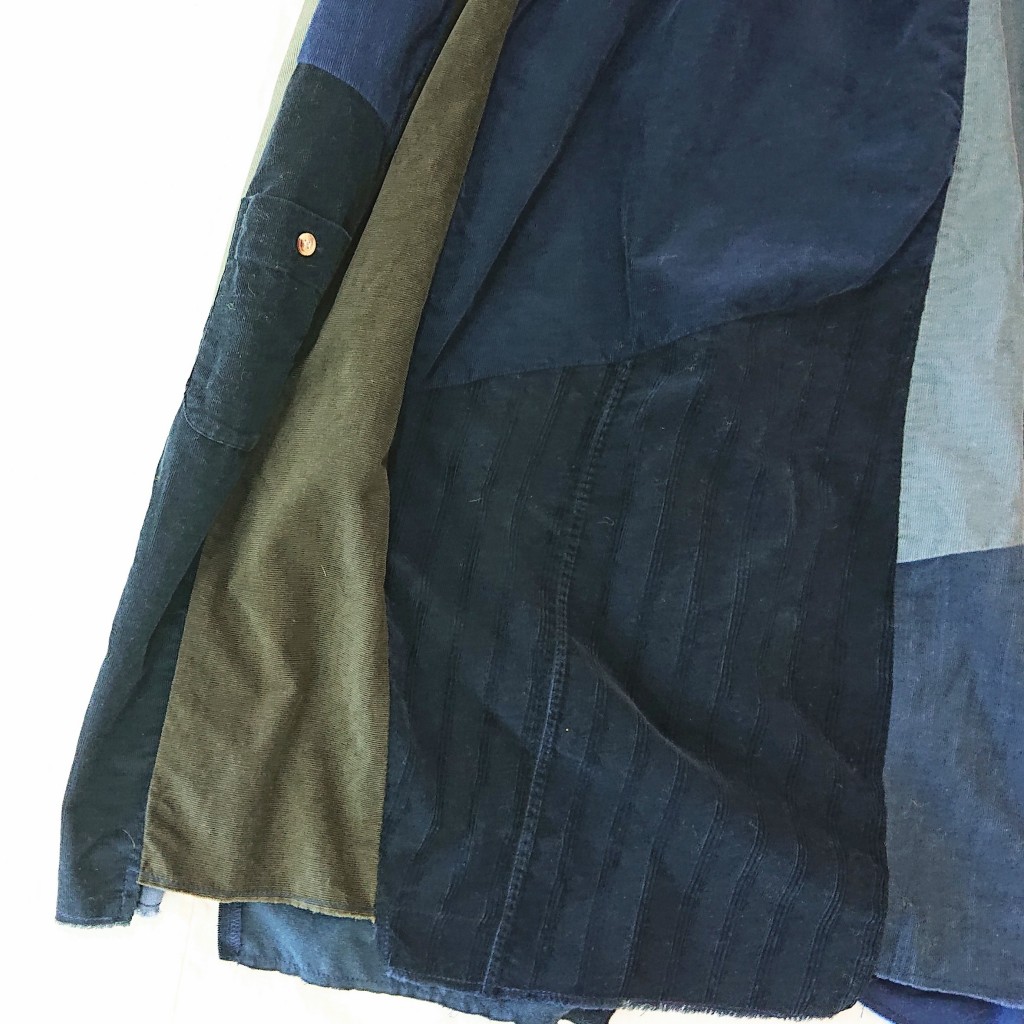 ヴィンテージのユーロコールシャツを解体し再構築。形はランダムパッチロングスカートを仕立てました。ブラウンとネイビーの色合いが少しずつ異なり、コーディネートのポイントになるスカートです。柄物のボトムを主役にコーディネートをお楽しみください。