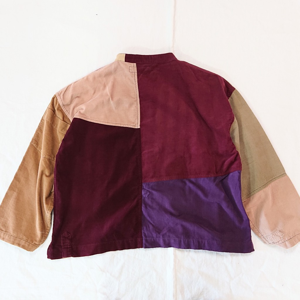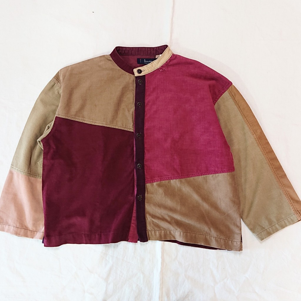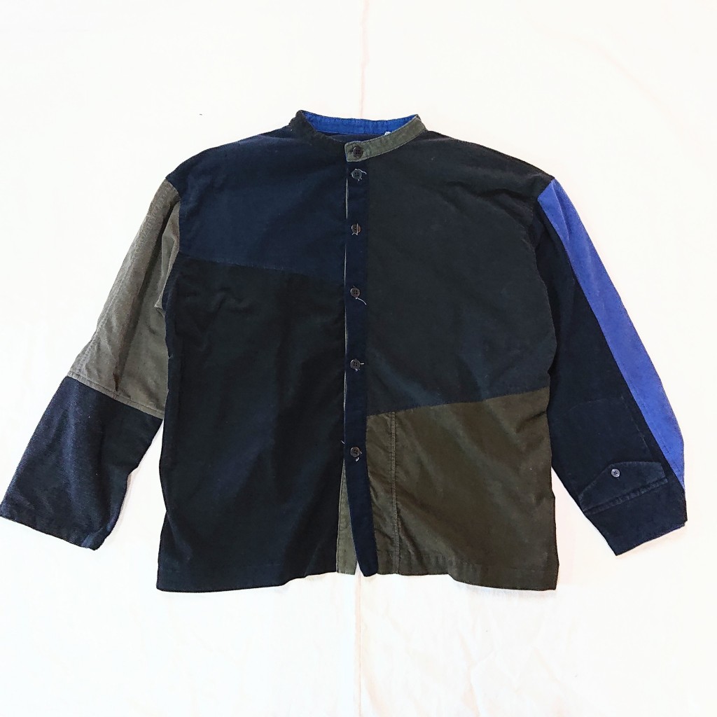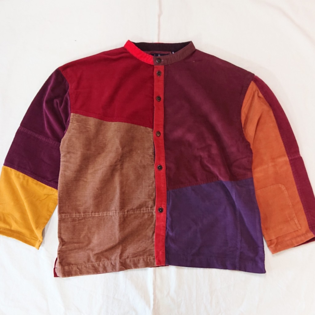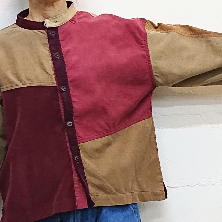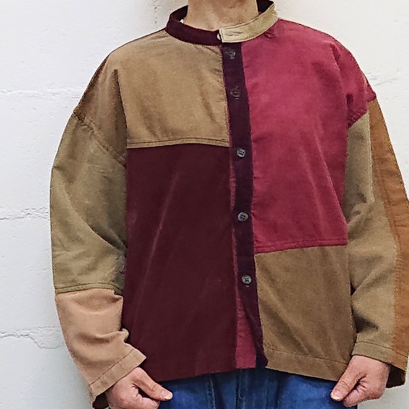 ヴィンテージのユーロコールシャツを解体し再構築。形は少し立ち上がった首元にゆったりとした身幅のヤッコシャツを仕立てました。比翼式の前開きタイプ、一枚でさらりと着るにも、もってこいの形です。